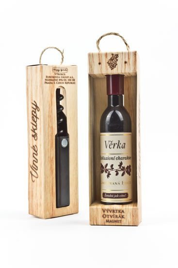 Vývrtka ve tvaru vinné lahve s originálním potiskem viněty je vhodným dárkem pro všechny milovníky vína.