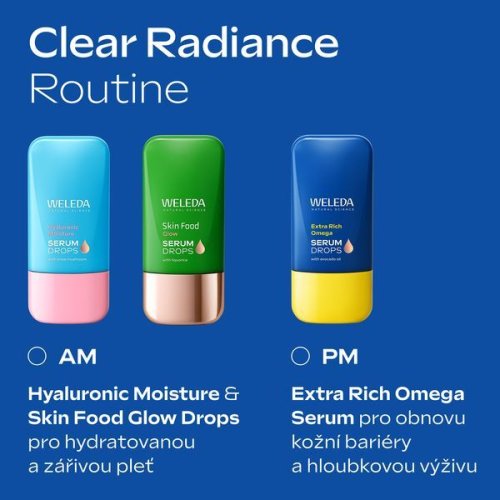 Extra Rich Omega Serum Drops s trojí silou omega 3, 6 a 9 mastných kyselin je navrženo pro intenzivní obnovu a ochranu suché, citlivé nebo narušené pleti. Díky synergii rostlinných olejů (avokádového, meruňkového, slunečnicového či ze světlice barvířské) sérum posiluje kožní bariéru, zklidňuje podráždění a podporuje regeneraci i pružnost pleti. Jojobový olej zajišťuje dlouhotrvající výživu bez zatížení, zatímco rakytníkový olej a extrakt z rozmarýnu přináší antioxidační ochranu. Výsledkem je okamžitý pocit hebké pleti a dlouhodobé zvýšení její odolnosti. Sérum lze použít samostatně, přidat pár kapek do pleťového kŕemu, nebo jako finální ochrannou vrstvu, která pomáhá uzamknout aktivní látky a znásobit jejich účinek. Jemně ovocná a hřejivá vůně ylang-ylangu, vanilky, pomeranče a tonky navíc promění každou aplikaci v aromaterapeutický rituál. Weleda Booster Serum Drops kombinují vysoce účinné rostlinné extrakty, inovativní aktivní látky a vědeckým výzkumem podložené složení, které se přizpůsobí vaší pleti přesně podle jejích aktuálních potřeb. Díky koncentrovanému složení je můžete snadno míchat, vrstvit nebo kombinovat pro dosažení cíleného efektu, ať už vaše pleť volá po hydrataci, zklidnění nebo prostě potřebuje dodat svěží glow!