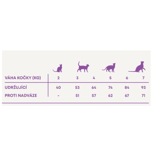 Krmný návod: změnu krmiva je třeba provádět postupně po dobu 7 dní. Jako návod použijte tabulku s dávkováním. Denní množství potravy se může pro každou kočku lišit, záleží na úrovni její aktivity, plemeni a podmínkách prostředí. Denní krmnou dávku podávejte rozdělenou na 2 porce denně, nepoužívejte zbytky krmiva z předchozího dne. Kočka musí mít vždy přístup k čisté, čerstvé vodě. Skladování: skladujte na chladném a suchém místě. Obal by měl být po použití vždy bezpečně uzavřen.