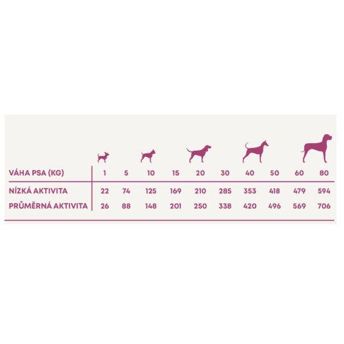 Krmný návod: změnu krmiva je třeba provádět postupně po dobu 7 dní. Jako návod použijte tabulku s dávkováním. Denní množství potravy se může pro každého psa lišit, záleží na úrovni jeho aktivity, plemeni a podmínkách prostředí. Denní krmnou dávku podávejte přednostně rozdělenou na 2 až 3 porce denně, a to vždy ve stejnou dobu. Pes musí mít vždy přístup k čisté, čerstvé vodě. Skladování: skladujte na chladném a suchém místě. Obal by měl být po použití vždy bezpečně uzavřen.