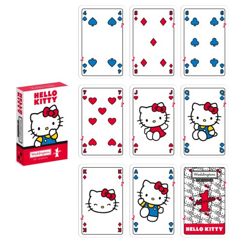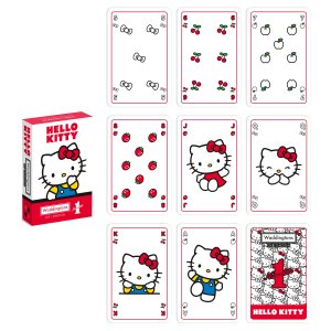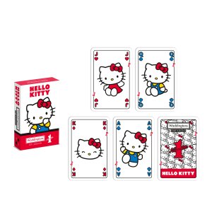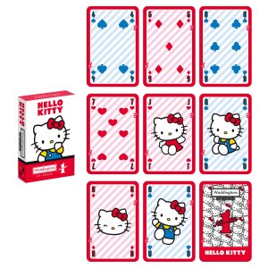 WADDINGTONS NO. 1 Hello Kitty Karty hrací. Karty s motivem Hello Kitty. Obsahuje 52 karet + 2 žolíky. Makao, remi nebo třeba oko? V co hrají ti nejvytrvalejší bojovníci? Užijte si jedinečnou atmosféru Hello Kitty s touto speciální sadou karet. Hrací karty Waddingtons No. 1 vynikají nejen designem, ale také vysokou kvalitou zpracování. Balíček si zachová svůj bezchybný tvar i po mnoha napínavých partiích! Spolehlivost materiálů zaručuje britská značka Waddingtons, která je na trhu již od roku 190