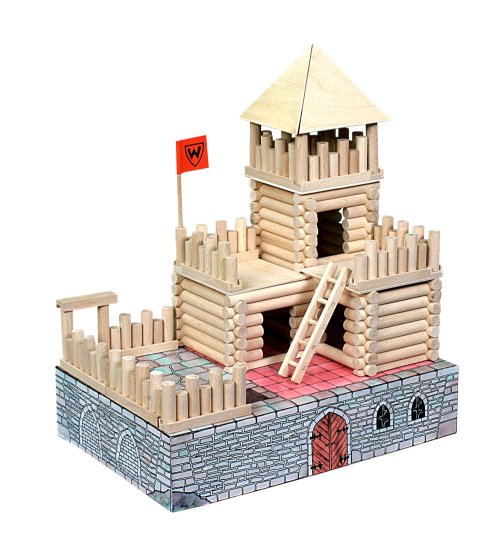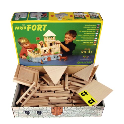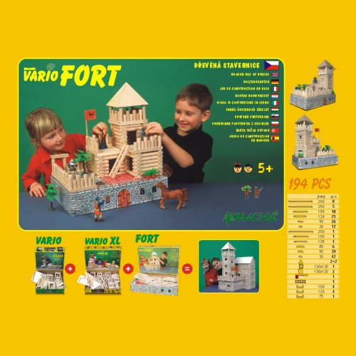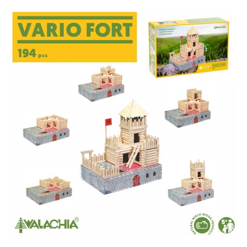 VARIO Fort je stavebnice středověkého hradu z masivního bukového dřeva o průměru 15 mm. Hrad lze postavit hned v několika variantách. Pevná kartónová krabice obalu je přizpůsobena potiskem tak, že dotváří hradby. Počet dílů: 194