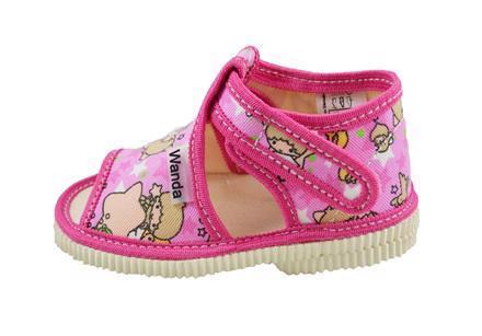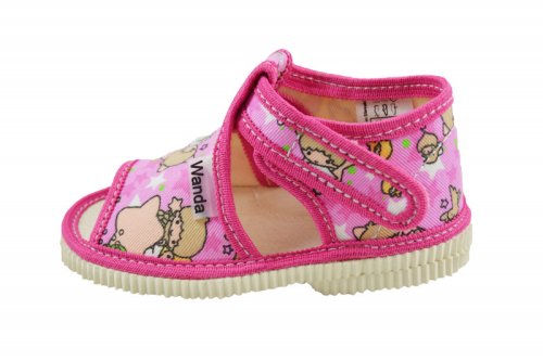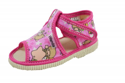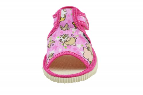 Veselé dětské bačkůrky z přírodního textilního materiálu sandálkového typu s otevřenou špičkou. Podešev je vyrobena z měkkého, ale odolného styroporu. Uzavírání je na suchý zip. Bačkůrky se skvěle přizpůsobí tvaru dětského nožičky. Zaručují pohodlnou chůzi a podporují zdravý vývoj dětské nožičky.