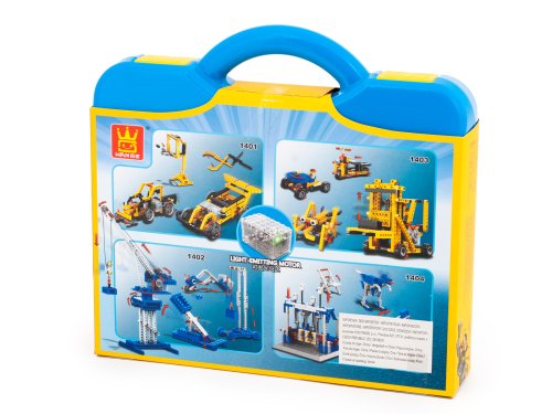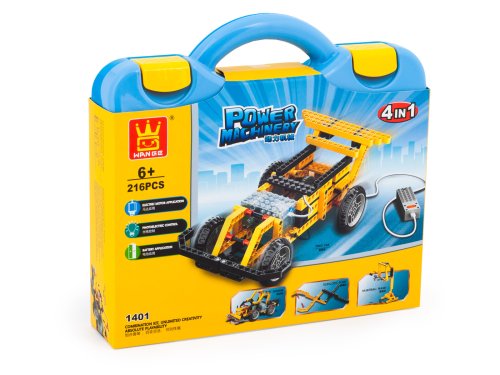 Balení obsahuje: 216 dílků stavebnice Wange, box na 2 x AA baterie (nejsou součástí balení), kabel, elektrický motůrek se světelnou diodou. K vložení baterie do nabíjecího ovladače je třeba použít šroubovák.