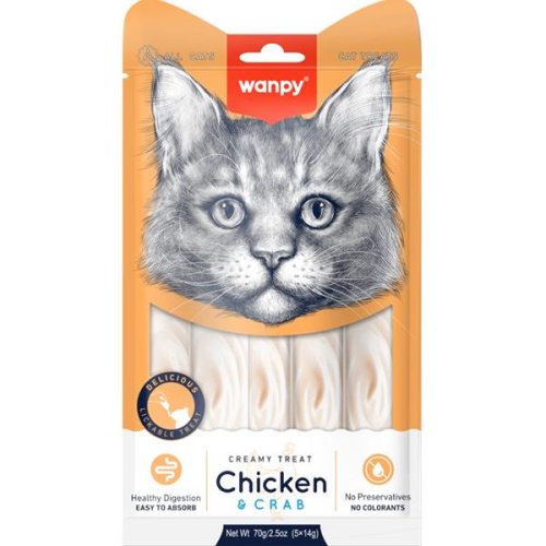 Složení: kuřecí maso, krab, škrob, taurin, čajový polyfenol, vitamíny (A, B2, B3, B5, D3, E), xantanová guma. Analytické složky: hrubý protein 6,5 %, hrubý tuk 0,1 %, hrubá vláknina 0,5 %, hrubý popel 1 %, vlhkost 90 %. Metabolizovatelná energie: 45 kcal/100 g Krmný návod: Aby podávaní pamlsků nevedlo k rozvoji nadváhy, odeberte vždy zvířeti z denní dávky běžného krmiva množství odpovídající denní výživové dávce pamlsků. Zvířeti zajistěte stálý přístup k čerstvé pitné vodě.