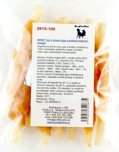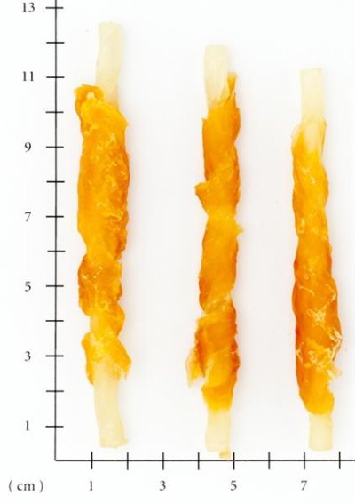 Složení: Kuřecí maso 40%, hovězí kůže 55%, kukuřičný škrob 1%, glycerin 2%, rostlinný protein 1,8%, přírodní sladidlo (maltitol) 1,9%, ocet 0,1%
