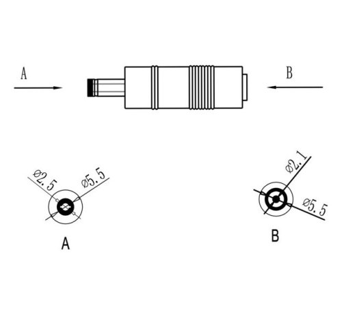 Napájecí redukce z konektoru 2,1 x 5,5 mm (F) na 2,5 x 5,5 mm (M). Maximální zátěžový proud pro redukci je 5,4 A.