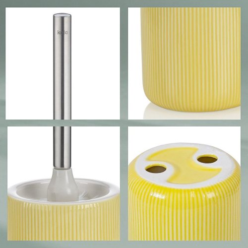 Toaletní sada Ava je vyrobená z keramiky a ve slunečně žluté barvě oživí vaši koupelnu. Rukojeť toaletní štětky je vyrobena z lesklé nerezové oceli, což dodává eleganci a zároveň je praktická. Toaletní set vybavený kartáčem La Brosse v elegantní černé barvě, který můžete snadno odšroubovat a kdykoli vyměnit.