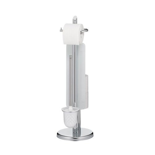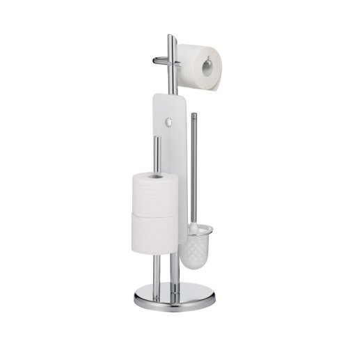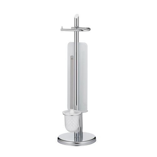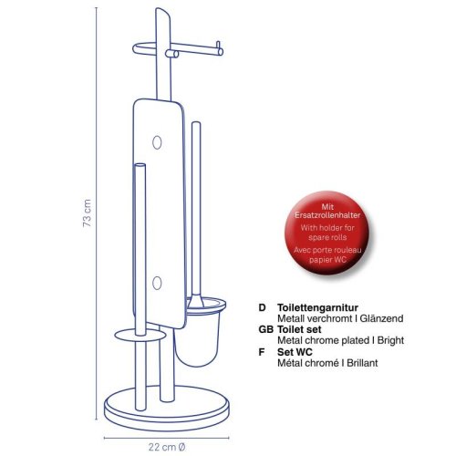 Kovová toaletní sada Ken ve stříbrné barvě s lesklým chromovým povrchem se hodí k mnoha stylům zařízení. Díky zaobleným prvkům základní desky, tyče a držáku papíru vypadá tato sada stojanů moderně a dynamicky. Varianta: stříbrná, výška: 73 cm, průměr základní desky: 22 cm. S nádobou na kartáč z plastu.S náhradním držákem role kovový chromovaný lesklý 22 cm , 73 cm v