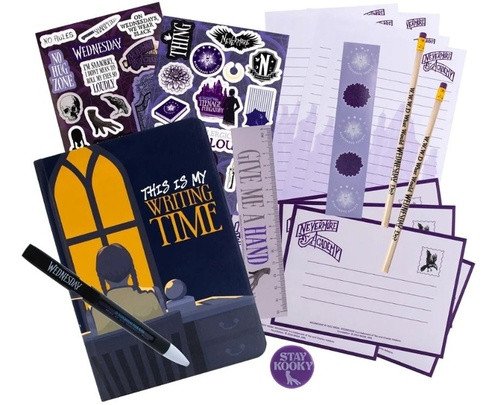 Dárkový box obsahuje úložný box, blok A5, pero, 7 archů samolepek, 2 tužky, 12 dopisních papírů, gumy, 6 obálek, pravítko