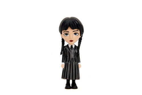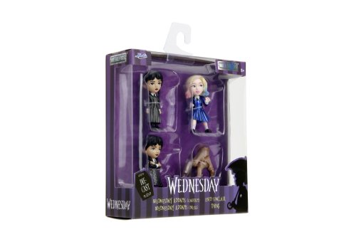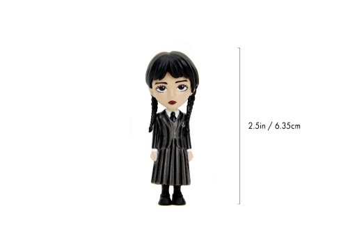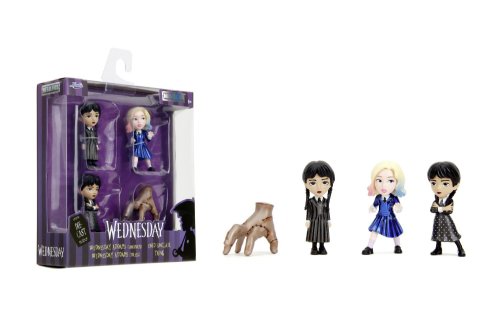Sada 4 kovových figurek z filmu "Wednesday" o velikosti 6 cm. Postavy: Wednesday "proužky", Věc, Wednesday "puntíky", Enid.