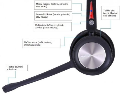 Náhlavní souprava je vybavena ovládacími prvky, uživatel může snadno ovládat hlasitost, vytočit poslední číslo nebo odmítnout příchozí hovor. Pro kvalitnější zvuk obsahuje mikrofon funkci rušení okolního hluku.