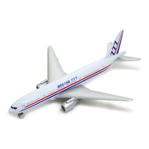 Miniatura dopravního letadla Boeing 777 z kovu a plastu. Dodáváno v různobarevné papírové krabičce s plastovým průhledem. Hlavní vlastnosti:kovové provedení
