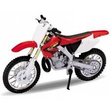 Miniatura motocyklu Honda CR250R z kovu a plastu má otočná řídítka a odpruženou zadní vidlici. Model je dodáván s podstavcem, na který je upevněn šroubem. Dodáváno v různobarevné papírové krabičce s plastovým průhledem. Hlavní vlastnosti:motocykl na podstavcikovová karoserieotočná řídítkaodpružená zadní vidlice