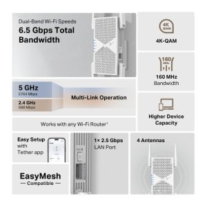 TP-Link RE405BE podporuje nejnovější standard WiFi 7 a nabízí přenosové rychlosti až 6,5 Gb/s. Díky 4 externím anténám a podpoře funkcí jako 4K-QAM, 160 MHz šířka kanálu a Multi-RUs poskytuje široký dosah a vysokou propustnost i pro více zařízení zároveň.