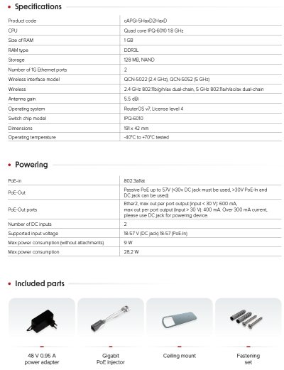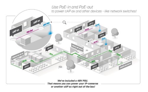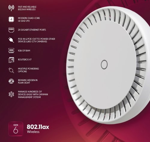 Nová generace bezdrátového zařízení značky MikroTik pro vaši kancelář, hotel nebo nákupní centrum je tady. Tento stropní WiFi router cAP ax, cAPGi-5HaxD2HaxD je skvělým přístupovým bodem a také výborným řešením, jak zamezit ztrátě signálu ve velkých, přeplněných oblastech. Díky bezdrátovému standardu 802.11ax 6. generace je k dispozici až o 40 % vyšší rychlost v pásmu 5GHz a až o 90 % vyšší rychlost ve spektru 2,4 GHz v porovnání s předchozími generacemi. Zařízení standardu AX jsou odolnější vůči i těm nejnáročnějším scénářům bezdrátového rušení a nabízí stabilnější a nepřerušovaný signál. Jelikož je zařízení vybaveno 48V napájením, lze z PoE-out portu zároveň napájet nejen další síťové prvky jako přepínače či další cAP jednotky, ale i kamery CCTV.