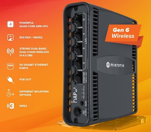 Domácí Wi-Fi router MikroTik hAP ax2 v provedení dual-band je malé zařízení s excelentním poměrem cena / výkon, které lze namontovat vertikálně i horizontálně bez jakýchkoliv kompromisů na sílu a stabilitu signálu. Podporuje nejmodernější standard 802.11ax Wave2, který přináší lepší multitasking, 2násobně vyšší propustnost kanálu a rozšířenou podporu pro 5GHz připojení. Bezdrátový signál je tak silnější než kdy jindy – až o 40 % vyšší rychlost v 5 GHz a až o 90 % vyšší rychlost ve spektru 2,4 GHz!