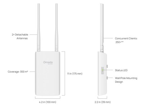 Přístupový bod nabízí rychlost až 1201 Mb/s v pásmu 5 GHz a 574 Mb/s v pásmu 2,4 GHz. Technologie OFDMA a MU-MIMO zajišťují stabilní připojení i při vyšším počtu současně připojených zařízení. Dvě externí antény s vysokým ziskem poskytují všesměrové pokrytí až 300 m v pásmu 5 GHz a až 200 m v pásmu 2,4 GHz.