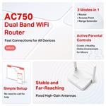 WiFi router Mercusys MR20 AC750 vám poskytne rychlé připojení pro všechna vaše zařízení. Zajišťuje dvoupásmovou Wi-Fi síť s rychlostí až 750 Mb/s (433 Mb/s v pásmu 5 GHz a 300 Mb/s v pásmu 2,4 GHz), díky které si dopřejete dokonalé podmínky pro práci nebo zábavu. První pásmo se hodí převážně pro sdílení odkazů, posílání emailů a surfování na internetu. Druhé pásmo je silnější a zvládne i náročnější úkoly jako streamování HD videa, hraní her a podobně.