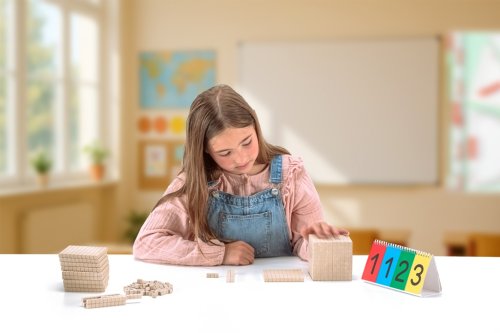 Dienesova základní sada pro názorné vyučování matematiky pomáhá dětem pochopit principy desítkové soustavy, vztahy mezi jednotkami, desítkami, stovkami a tisícem. Manipulací s kostkami si žáci osvojují číselné struktury, rozvíjejí porozumění místní hodnotě číslic a učí se převádět mezi různými číselnými zápisy. Pomůcka je vhodná pro skupinovou i individuální práci, podporuje srovnávání objemů i základní prostorovou představivost. Dienes je pojmenování didaktických pomůcek a metodiky pro výuku matematiky vyvinutých Zoltánem P. Dienesem. Dienesovy bloky jsou soubory kostek, tyček a destiček různých velikostí a barev, které představují jednotky, desítky, stovky a tisíce. Tyto pomůcky slouží k názornému učení základních matematických konceptů, zejména desítkové soustavy, počítání, sčítání, odčítání a pochopení místa číslic v čísle. Vyrobeno z ekologického a odolného materiálu RE-Wood® v přírodní barvě. Zabaleno v kartonové krabičce s návodem. Obsah balení: 100 jednotlivých kostek10 desítkových tyček10 stovkových desek1 kostka tisícenávod Hlavní vlastnosti: zvýrazňuje strukturu čísel a desítkového systémupracuje s jednotkami, desítkami, stovkami a tisícemrozvíjí porozumění místní hodnotě číslicpodporuje porovnávání objemů a budování tělesvhodné pro individuální i skupinovou prácivyrobeno ze 100% recyklované dřevo RE-Wood® vyrobeno v Německuvhodné pro děti od 6 let