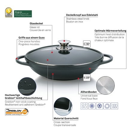 - materiál: tlakově litý hliník- vnitřní keramický povrch GREBLON C3+- průměr: 32 cm- výška: 8,5 cm- tloušťka stěny: 5 mm- objem: 4 l- skleněné poklice- vhodná pro všechny typy ohřevů včetně indukce- …