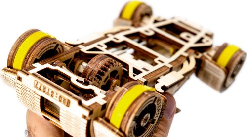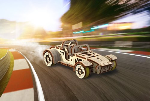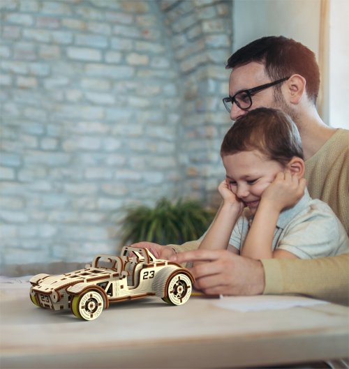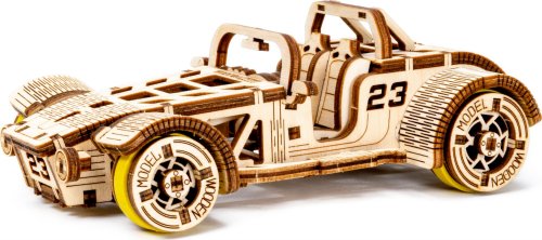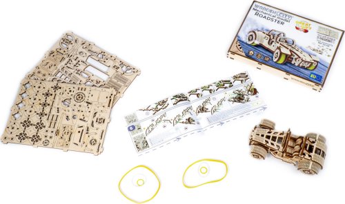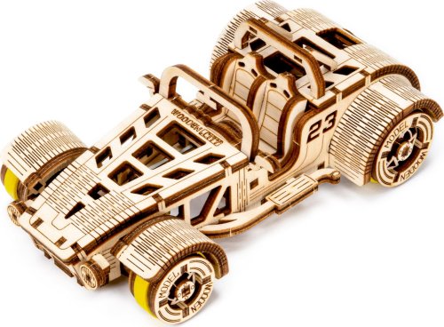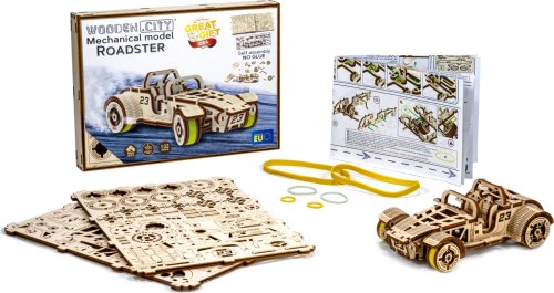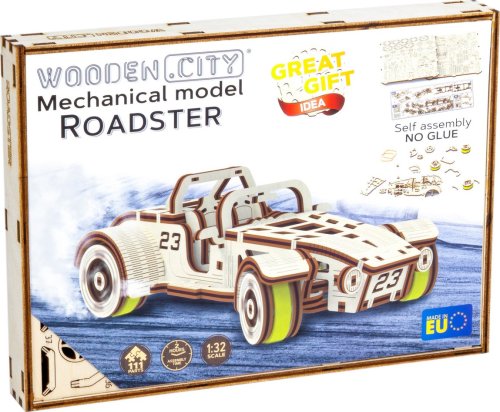 Sportovní vůz Roadster je vytvořen pro extrémně sebevědomé osoby. Roadster má dvojité sedadlo pro pohledného závodníka a jeho krásnou přítelkyni. Setrvačníkový mechanismus, vratná kola, přední otočná kola, pogumovaná kola a dokonalý design. Stačí projet cílovou páskou a budeš opravdovým závodníkem. Model má několik detailů skutečného automobilu: - poznávací značku, - přední otočná kola, - setvačníkový mechanismus, - vratná kola, - detailní motor, - dvojité sedadlo. 3D puzzle WOODEN CITY Roadster je skvělým dárkem pro každého milovníka sportovních vozů. Obtížnost: 3 z 5 (dle rozdělení Wooden City) Orientační doba na složení: 2 hodiny Měřítko: 1:32 Dřevěné 3D puzzle WOODEN CITY jsou detailně propracované funkční mechanické modely, které se skládají bez lepidla nebo nářadí. Jsou vyrobeny z ekologických dřevěných materiálů - kvalitní březové překližky. S mechanickými dřevěnými puzzle WOODEN CITY zažijete hodiny zábavy při skládání a poznáte převody, gumičkové motory, ozubená kolečka a další součástky z bezprostřední blízkosti.