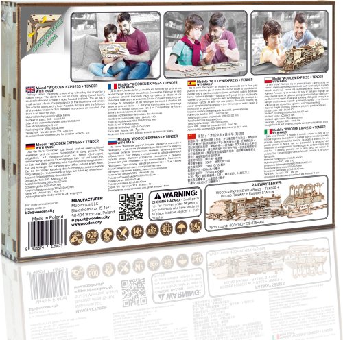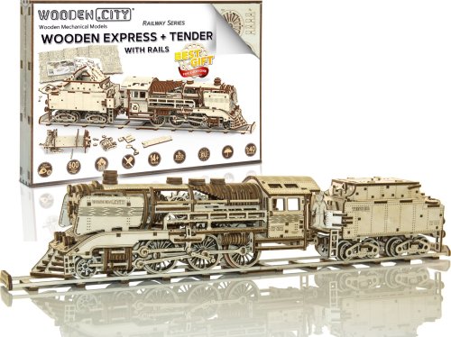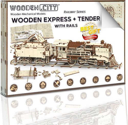 Tato úžasná sada bude skvělým způsobem jak trávit volný čas. Dokonale navržený dřevěný Express s tendrem a realistickými detaily vám pomůže vrátit se do minulosti a oživit své vzpomínky na dětství. Sestavte model s kamarády nebo dětmi, postavte ho na koleje a užijte si chvíle zábavy a štěstí v přítomnosti. - startuje se speciálním klíčem - dvířka od spalovny - hnací kola - spřáhlo spojující express a tendr - jezdí dopředu, dozadu a dokola - sestavený model: 55,8 x 11 x 12,2 cm - rozměry kolejí: 60 x 6,1 x 1,5 cm