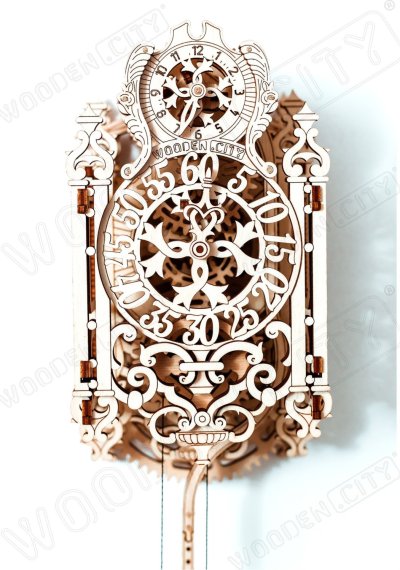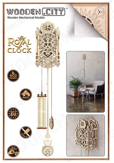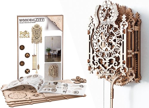 Královské hodiny jsou důstojnou ozdobou stěn královských komnat na každém starobylém hradě. Tento mimořádně krásný a jedinečný prvek je doplněn kyvadlovým mechanismem. Královské hodiny WOODEN CITY jsou neobyčejně krásné 3D dřevěné puzzle s pokročilou složitostí. - Model v rokorovém stylu s vyřezanými ozdobnými propletenými detaily. - Elegantní a rafinované linie. - Dva ciferníky: malý s hodinovou ručičkou nahoře a velký s minutovou uprostřed modelu. - Průběh času závisí na počtu mincí, které vložíte do kyvadla. Protože dodatečná hmotnost mění těžiště kyvadla a velikost tření, které na něj působí, čím více mincí vložíte, tím delší bude jeho perioda (a pomalejší chod). Pohádkové hodiny můžete natahovat, stejně jako u skutečných kukačkových hodin. Tikání bude v místnosti slyšet po dobu 12 hodin. Královské hodiny jsou speciálně sestavené mistrovské dílo určené pro znalce a zdobené tenkými, složitými vzory, které jsou kombinovány podle přesných výpočtů řídících mechaniku jejich částí. 3D puzzle WOODEN CITY Royal Clock - Královské hodiny s jemně provedenou dřevořezbou jsou neobvyklým dárkem pro vaše blízké a milovníky krásy a překvapení. Obtížnost: 5 z 5 (dle rozdělení Wooden City) Orientační doba na složení: 5 hodin Dřevěné 3D puzzle WOODEN CITY jsou detailně propracované funkční mechanické modely, které se skládají bez lepidla nebo nářadí. Jsou vyrobeny z ekologických dřevěných materiálů - kvalitní březové překližky. S mechanickými dřevěnými puzzle WOODEN CITY zažijete hodiny zábavy při skládání a poznáte převody, gumičkové motory, ozubená kolečka a další součástky z bezprostřední blízkosti.