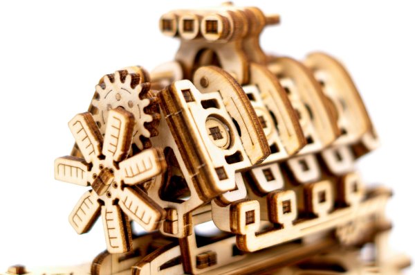 Dřevěné mechanické 3D puzzle spalovacího motoru ve tvaru V, který se používá v závodních vozech Formule 1 .