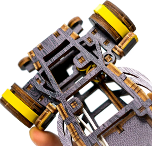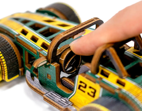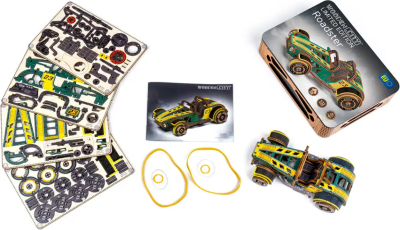 Funkční mechanický model. Skládání bez použití lepidla nebo nářadí. Kvalitní zpracování z přírodního materiálu. Propracované detaily. Návod ke stažení pomocí QR kódu na obale.