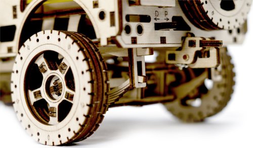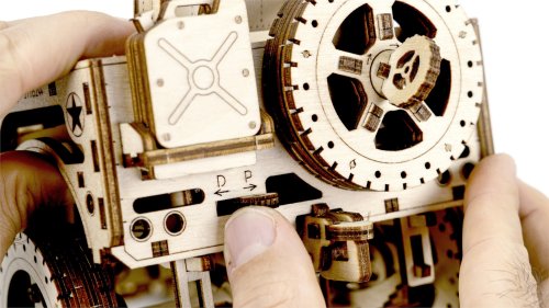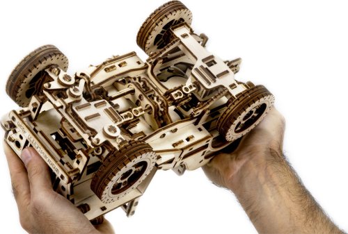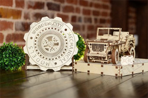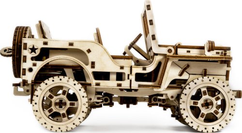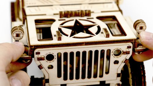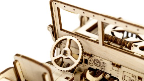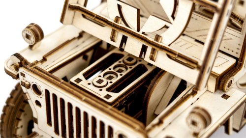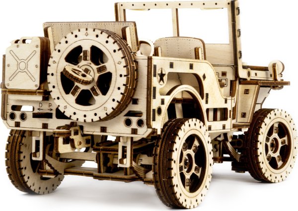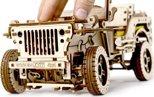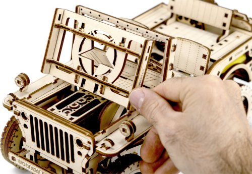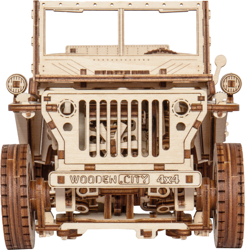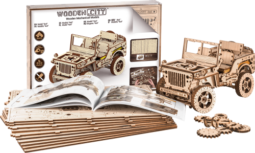 Po sestavení nastavte polohu páky na jízdu vpřed nebo vzad, dejte zamykací páku do polohy stop, natočte model klíčkem (klíč najdete v rezervním kole) a poté spusťte zamykací páku. Džíp má řízení předních kol. Kapota se otevírá a zavírá a je zajištěna dvěma sponami a čelní sklo se vyklápí. 3D puzzle WOODEN CITY Model 4x4 je neobvyklým dárkem pro vaše blízké a milovníky silných vozů. Obtížnost: 5 z 5 (dle rozdělení Wooden City) Orientační doba na složení: 12 hodin Měřítko: 1:12 Dřevěné 3D puzzle WOODEN CITY jsou detailně propracované funkční mechanické modely, které se skládají bez lepidla nebo nářadí. Jsou vyrobeny z ekologických dřevěných materiálů - kvalitní březové překližky. S mechanickými dřevěnými puzzle WOODEN CITY zažijete hodiny zábavy při skládání a poznáte převody, gumičkové motory, ozubená kolečka a další součástky z bezprostřední blízkosti.