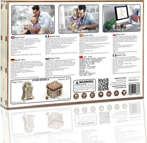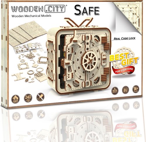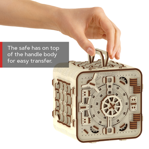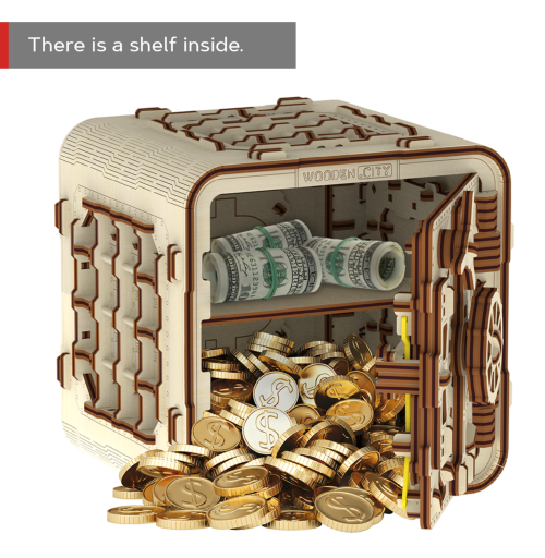 Pokud nevíte, kam bankovky schovat, bude tento model skvělou volbou. Stačí si vymyslet vlastní číselný kód a nikomu ho neříkat. Díky jedinečnému designu a překvapivým detailům tohoto modelu bude vaše trávení času plné zábavy a skvělých emocí. Některé funkce sestaveného modelu: ⠀ - mechanismus napodobuje činnost bankovního trezoru; - trezor má na horní části těla rukojeť pro snadné přenášení; - uvnitř je polička; - dveře mají mechanický zámek s kódovou kombinací tří čísel; - číselnou hodnotu kódu lze kdykoli změnit; - v případě, že jste zapomněli heslo, můžete použít tajnou funkci a trezor otevřít (tento způsob je popsán v návodu). 3D puzzle WOODEN CITY Safe je neobvyklým dárkem pro milovníky krásy a překvapení.