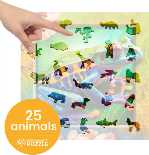 Laserem vyřezávané dřevěné puzzle WOODEN CITY se svými speciálně tvarovanými dílky je neskutečně zábavné. Část dílků je vyrobena ve tvaru zvířat , jejichž výsledný efekt umocňují laserem zvýrazněné detaily. Tyto dílky mohou samostatně stát jako drobné figurky. Skládání puzzle s různotvarými dílky je obtížnější a představuje větší výzvu, než skládání klasického puzzle. Značka WOODEN CITY kromě unikátního konceptu puzzle nezapomíná na ekologii, u těchto výrobku proto nenaleznete žádné plastové obaly .