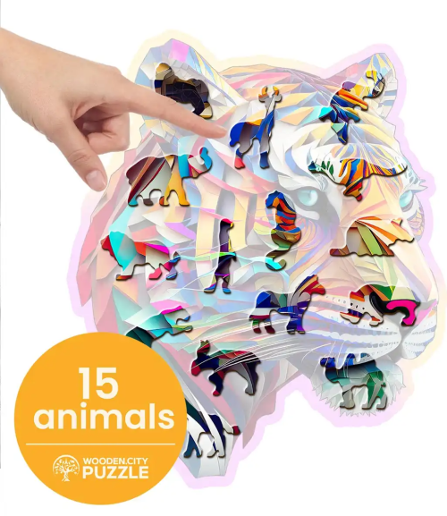 Laserem vyřezávané dřevěné puzzle WOODEN CITY se svými speciálně tvarovanými dílky je neskutečně zábavné. Část dílků je vyrobena ve tvaru zvířat , jejichž výsledný efekt umocňují laserem zvýrazněné detaily. Tyto dílky mohou samostatně stát jako drobné figurky. Skládání puzzle s různotvarými dílky je obtížnější a představuje větší výzvu, než skládání klasického puzzle. Značka WOODEN CITY kromě unikátního konceptu puzzle nezapomíná na ekologii, u těchto výrobku proto nenaleznete žádné plastové obaly .