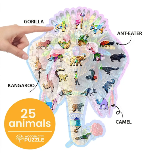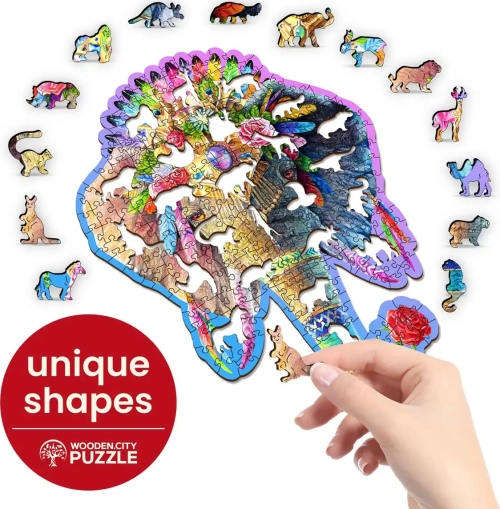 Laserem vyřezávané dřevěné puzzle WOODEN CITY se svými speciálně tvarovanými dílky je neskutečně zábavné. Část dílků je vyrobena ve tvaru zvířat , jejichž výsledný efekt umocňují laserem zvýrazněné detaily. Tyto dílky mohou samostatně stát jako drobné figurky. Skládání puzzle s různotvarými dílky je obtížnější a představuje větší výzvu, než skládání klasického puzzle. Značka WOODEN CITY kromě unikátního konceptu puzzle nezapomíná na ekologii, u těchto výrobku proto nenaleznete žádné plastové obaly .