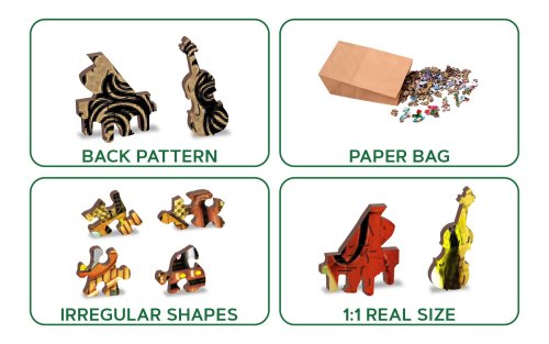 s unikátně tvarovanými dílky představující známé stavby, předměty nebo zvířata podle tématu motivu vyšší obtížnost při menším počtu dílků - skládání puzzle s různotvarými dílky je náročnější oboustranné puzzle 2v1 - z jedné strany je obrázek, z druhé opakující se vzor pro skládání podle tvaru hladké hrany bez třísek díky preciznímu laserovému zpracování vyrobeno z pevné dřevovláknité HDF desky o síle 3-4mm uvnitř balení je samostatná předloha na skládání EKO Friendly 100% bez plastových obalů - puzzle je v papírovém sáčku uvnitř papírové krabičky vhodný dárek pro jakoukoliv příležitost
