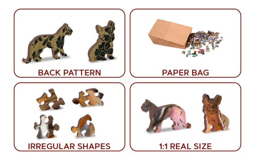 s unikátně tvarovanými dílky představující známé stavby, předměty nebo zvířata podle tématu motivu vyšší obtížnost při menším počtu dílků - skládání puzzle s různotvarými dílky je náročnější oboustranné puzzle 2v1 - z jedné strany je obrázek, z druhé opakující se vzor pro skládání podle tvaru hladké hrany bez třísek díky preciznímu laserovému zpracování vyrobeno z pevné dřevovláknité HDF desky o síle 3-4mm uvnitř balení je samostatná předloha na skládání EKO Friendly 100% bez plastových obalů - puzzle je v papírovém sáčku uvnitř papírové krabičky vhodný dárek pro jakoukoliv příležitost