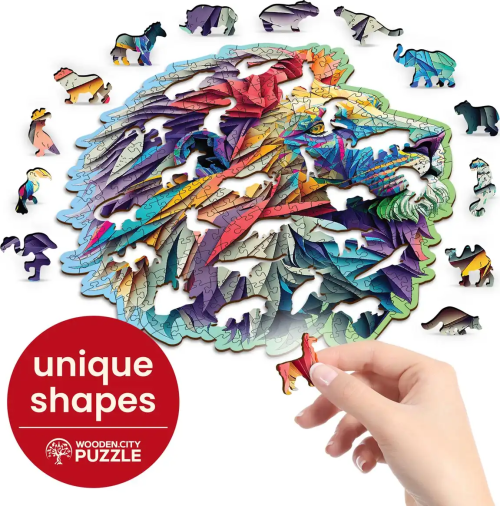 Laserem vyřezávané dřevěné puzzle WOODEN CITY se svými speciálně tvarovanými dílky je neskutečně zábavné. Část dílků je vyrobena ve tvaru zvířat , jejichž výsledný efekt umocňují laserem zvýrazněné detaily. Tyto dílky mohou samostatně stát jako drobné figurky. Skládání puzzle s různotvarými dílky je obtížnější a představuje větší výzvu, než skládání klasického puzzle. Značka WOODEN CITY kromě unikátního konceptu puzzle nezapomíná na ekologii, u těchto výrobku proto nenaleznete žádné plastové obaly .