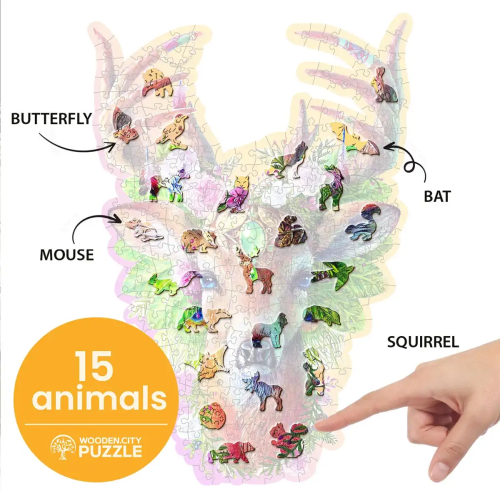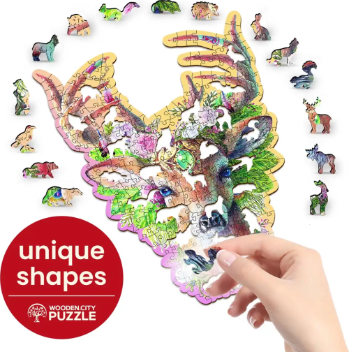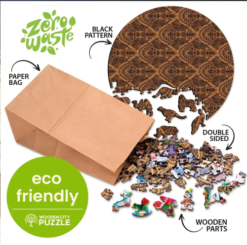 Laserem vyřezávané dřevěné puzzle WOODEN CITY se svými speciálně tvarovanými dílky je neskutečně zábavné. Část dílků je vyrobena ve tvaru zvířat , jejichž výsledný efekt umocňují laserem zvýrazněné detaily. Tyto dílky mohou samostatně stát jako drobné figurky. Skládání puzzle s různotvarými dílky je obtížnější a představuje větší výzvu, než skládání klasického puzzle. Značka WOODEN CITY kromě unikátního konceptu puzzle nezapomíná na ekologii, u těchto výrobku proto nenaleznete žádné plastové obaly .