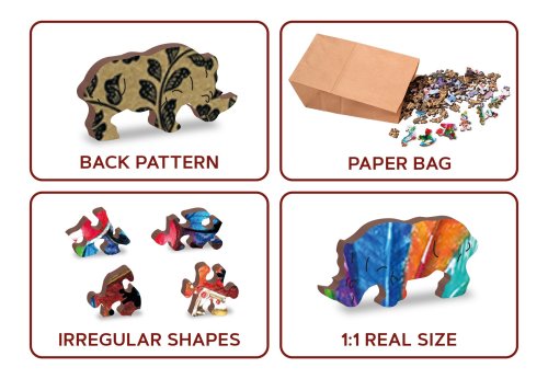 s unikátně tvarovanými dílky ve tvaru zvířat vyšší obtížnost při menším počtu dílků - skládání puzzle s různotvarými dílky je náročnější hladké hrany bez třísek díky preciznímu laserovému zpracování vyrobeno z pevné dřevovláknité HDF desky o síle 3-4mm uvnitř balení je samostatná předloha na skládání EKO Friendly 100% bez plastových obalů - puzzle je v papírovém sáčku uvnitř papírové krabičky vhodný dárek pro jakoukoliv příležitost