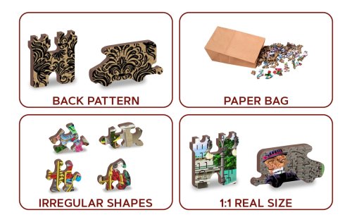 s unikátně tvarovanými dílky představující známé stavby, předměty nebo zvířata podle tématu motivu vyšší obtížnost při menším počtu dílků - skládání puzzle s různotvarými dílky je náročnější oboustranné puzzle 2v1 - z jedné strany je obrázek, z druhé opakující se vzor pro skládání podle tvaru hladké hrany bez třísek díky preciznímu laserovému zpracování vyrobeno z pevné dřevovláknité HDF desky o síle 3-4mm uvnitř balení je samostatná předloha na skládání EKO Friendly 100% bez plastových obalů - puzzle je v papírovém sáčku uvnitř papírové krabičky vhodný dárek pro jakoukoliv příležitost