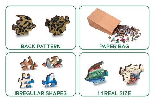 s unikátně tvarovanými dílky představující známé stavby, předměty nebo zvířata podle tématu motivu vyšší obtížnost při menším počtu dílků - skládání puzzle s různotvarými dílky je náročnější oboustranné puzzle 2v1 - z jedné strany je obrázek, z druhé opakující se vzor pro skládání podle tvaru hladké hrany bez třísek díky preciznímu laserovému zpracování vyrobeno z pevné dřevovláknité HDF desky o síle 3-4mm uvnitř balení je samostatná předloha na skládání EKO Friendly 100% bez plastových obalů - puzzle je v papírovém sáčku uvnitř papírové krabičky vhodný dárek pro jakoukoliv příležitost