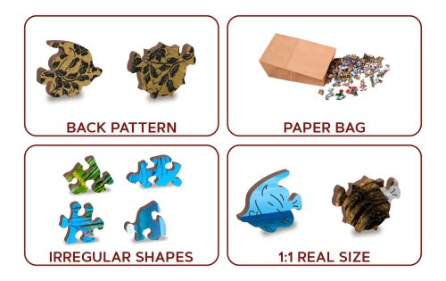 s unikátně tvarovanými dílky představující známé stavby, předměty nebo zvířata podle tématu motivu vyšší obtížnost při menším počtu dílků - skládání puzzle s různotvarými dílky je náročnější oboustranné puzzle 2v1 - z jedné strany je obrázek, z druhé opakující se vzor pro skládání podle tvaru hladké hrany bez třísek díky preciznímu laserovému zpracování vyrobeno z pevné dřevovláknité HDF desky o síle 3-4mm uvnitř balení je samostatná předloha na skládání EKO Friendly 100% bez plastových obalů - puzzle je v papírovém sáčku uvnitř papírové krabičky vhodný dárek pro jakoukoliv příležitost