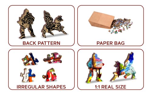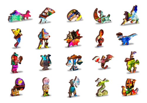 s unikátně tvarovanými dílky představující známé stavby, předměty nebo zvířata podle tématu motivu vyšší obtížnost při menším počtu dílků - skládání puzzle s různotvarými dílky je náročnější oboustranné puzzle 2v1 - z jedné strany je obrázek, z druhé opakující se vzor pro skládání podle tvaru hladké hrany bez třísek díky preciznímu laserovému zpracování vyrobeno z pevné dřevovláknité HDF desky o síle 3-4mm uvnitř balení je samostatná předloha na skládání EKO Friendly 100% bez plastových obalů - puzzle je v papírovém sáčku uvnitř papírové krabičky vhodný dárek pro jakoukoliv příležitost