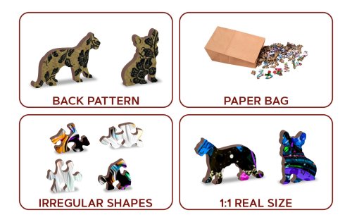 s unikátně tvarovanými dílky představující známé stavby, předměty nebo zvířata podle tématu motivu vyšší obtížnost při menším počtu dílků - skládání puzzle s různotvarými dílky je náročnější oboustranné puzzle 2v1 - z jedné strany je obrázek, z druhé opakující se vzor pro skládání podle tvaru hladké hrany bez třísek díky preciznímu laserovému zpracování vyrobeno z pevné dřevovláknité HDF desky o síle 3-4mm uvnitř balení je samostatná předloha na skládání EKO Friendly 100% bez plastových obalů - puzzle je v papírovém sáčku uvnitř papírové krabičky vhodný dárek pro jakoukoliv příležitost