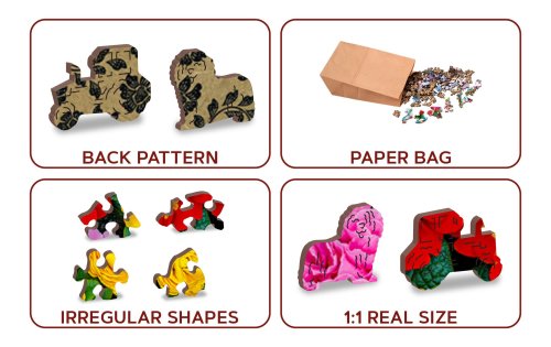 s unikátně tvarovanými dílky představující známé stavby, předměty nebo zvířata podle tématu motivu vyšší obtížnost při menším počtu dílků - skládání puzzle s různotvarými dílky je náročnější oboustranné puzzle 2v1 - z jedné strany je obrázek, z druhé opakující se vzor pro skládání podle tvaru hladké hrany bez třísek díky preciznímu laserovému zpracování vyrobeno z pevné dřevovláknité HDF desky o síle 3-4mm uvnitř balení je samostatná předloha na skládání EKO Friendly 100% bez plastových obalů - puzzle je v papírovém sáčku uvnitř papírové krabičky vhodný dárek pro jakoukoliv příležitost
