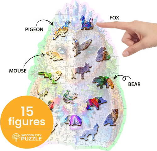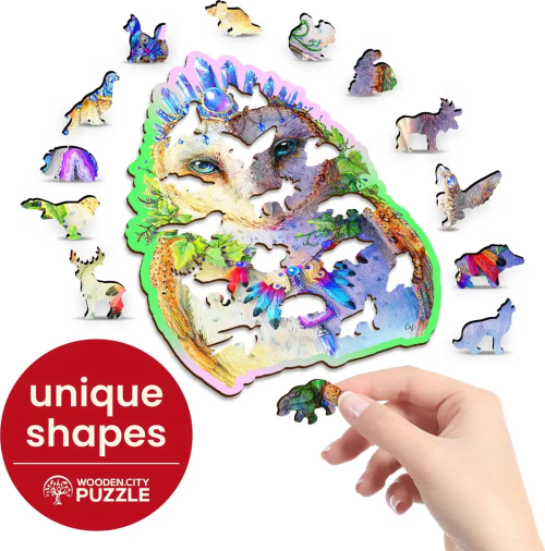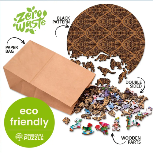 Laserem vyřezávané dřevěné puzzle WOODEN CITY se svými speciálně tvarovanými dílky je neskutečně zábavné. Část dílků je vyrobena ve tvaru zvířat , jejichž výsledný efekt umocňují laserem zvýrazněné detaily. Tyto dílky mohou samostatně stát jako drobné figurky. Skládání puzzle s různotvarými dílky je obtížnější a představuje větší výzvu, než skládání klasického puzzle. Značka WOODEN CITY kromě unikátního konceptu puzzle nezapomíná na ekologii, u těchto výrobku proto nenaleznete žádné plastové obaly .