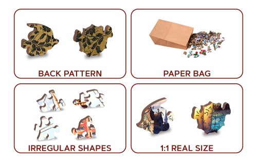 s unikátně tvarovanými dílky představující známé stavby, předměty nebo zvířata podle tématu motivu vyšší obtížnost při menším počtu dílků - skládání puzzle s různotvarými dílky je náročnější oboustranné puzzle 2v1 - z jedné strany je obrázek, z druhé opakující se vzor pro skládání podle tvaru hladké hrany bez třísek díky preciznímu laserovému zpracování vyrobeno z pevné dřevovláknité HDF desky o síle 3-4mm uvnitř balení je samostatná předloha na skládání EKO Friendly 100% bez plastových obalů - puzzle je v papírovém sáčku uvnitř papírové krabičky vhodný dárek pro jakoukoliv příležitost