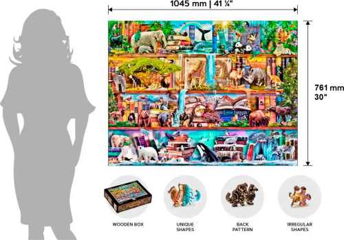 s unikátně tvarovanými dílky představující známé stavby, předměty nebo zvířata podle tématu motivu vyšší obtížnost při menším počtu dílků - skládání puzzle s různotvarými dílky je náročnější oboustranné puzzle 2v1 - z jedné strany je obrázek, z druhé opakující se vzor pro skládání podle tvaru hladké hrany bez třísek díky preciznímu laserovému zpracování vyrobeno z pevné dřevovláknité HDF desky o síle 3-4mm uvnitř balení je samostatná předloha na skládání vhodný dárek pro jakoukoliv příležitost