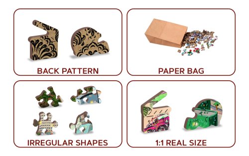 s unikátně tvarovanými dílky představující známé stavby, předměty nebo zvířata podle tématu motivu vyšší obtížnost při menším počtu dílků - skládání puzzle s různotvarými dílky je náročnější oboustranné puzzle 2v1 - z jedné strany je obrázek, z druhé opakující se vzor pro skládání podle tvaru hladké hrany bez třísek díky preciznímu laserovému zpracování vyrobeno z pevné dřevovláknité HDF desky o síle 3-4mm uvnitř balení je samostatná předloha na skládání EKO Friendly 100% bez plastových obalů - puzzle je v papírovém sáčku uvnitř papírové krabičky vhodný dárek pro jakoukoliv příležitost